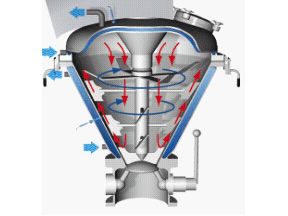 VC混合機由擺線減速機連接中心螺桿及外層螺帶以相同轉速運轉。工作時中心螺桿將混合物料由底部提升到頂部,同時線速度較大的外部螺帶將物料由下向上沿錐形桶壁盤提升,兩種運動在離心力作用下又將物料沿切線方向拋向空間,物料產生強烈的對流剪切、擴散,從而達到快速混合的目的(中心螺桿也可做成反向螺桿)。